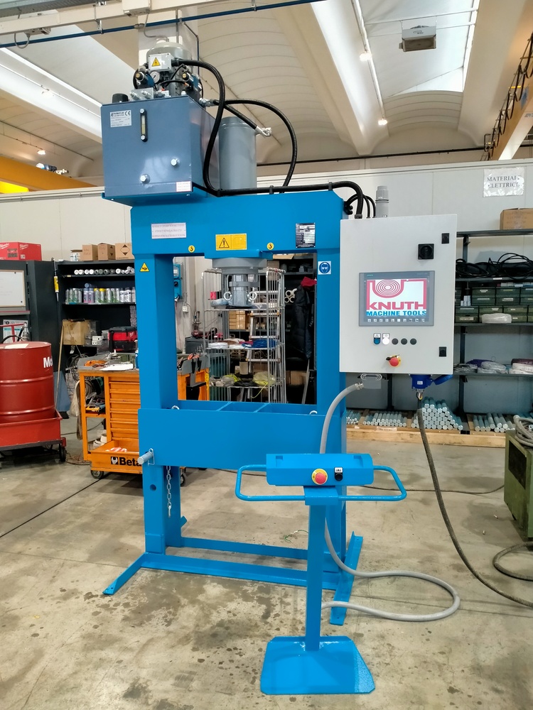 Operator safety is paramount, and this H-frame hydraulic press is operated via a dual two-button control system, requiring simultaneous engagement as mandated by stringent European safety standards. This two-hand control mechanism ensures that the operator’s hands are safely positioned away from the working area during the pressing cycle.