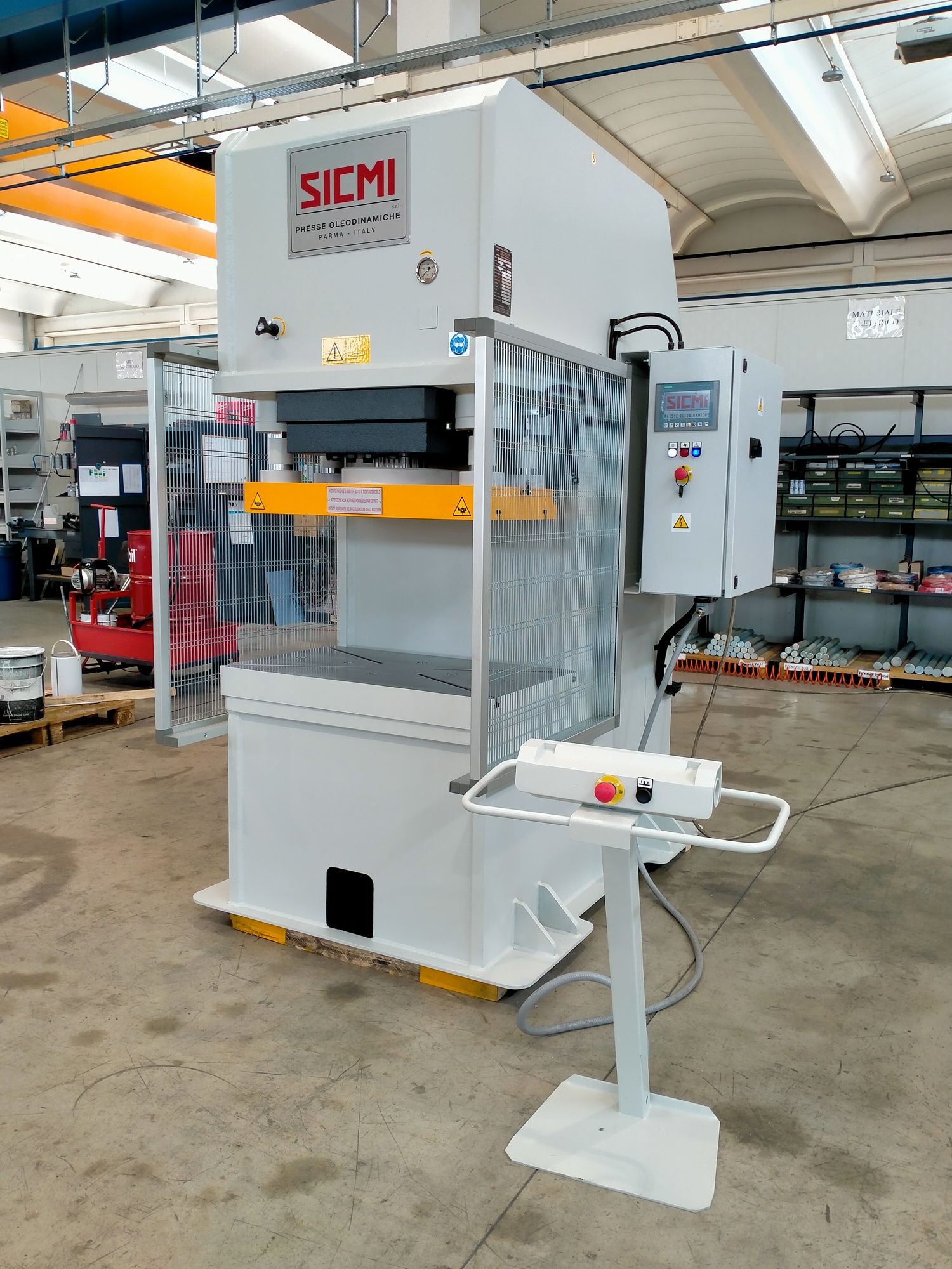 Operational safety is paramount. This electro-hydraulic press requires simultaneous activation of dual pushbuttons, adhering strictly to current safety standards. Additionally, the working area is securely enclosed by fixed metal guards on the sides, providing an extra layer of protection for operators.