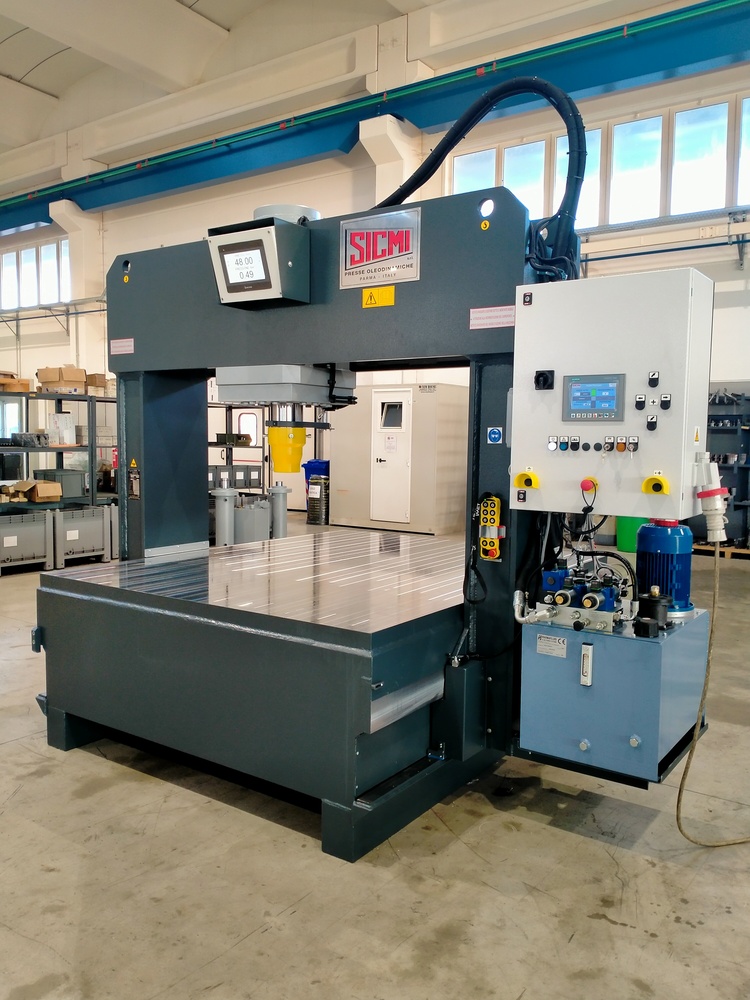 The values programmed into the digital control are conveniently displayed on two screens: one mounted on the side of the press and another positioned on the mobile frame. The latter display provides real-time viewing of the cylinder stroke and the current working pressure, offering immediate feedback to the operator.