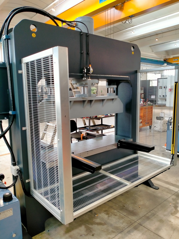 This newly produced hydraulic press bending machine is ready for shipment to a school in the Caribbean. This robust machine delivers a power of 100 tons. Its substantial distance between the columns, measuring 1550mm, allows it to bend exceptionally wide steel plates. This makes it a versatile tool for educational purposes.